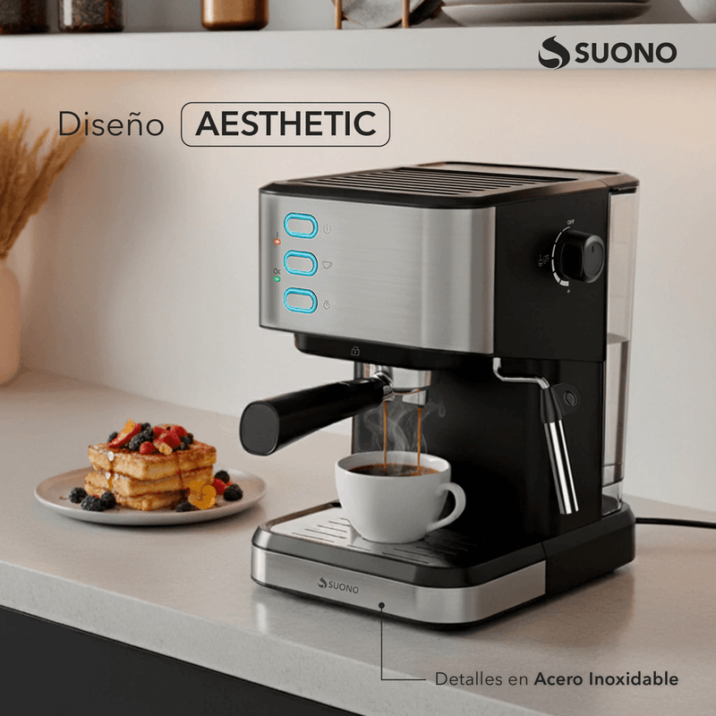 Disfrutá de un café intenso, aromático y con crema perfecta gracias a la Cafetera Espresso Suono 1050W 20 Bar, diseñada para ofrecer extracción de calidad profesional en tu hogar. Su bomba de alta presión, estructura con detalles en acero inoxidable y su funcionamiento intuitivo permiten preparar espresso, cortado, latte o cappuccino con total facilidad.
