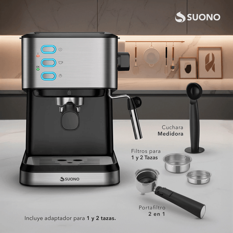 ¡Viví la experiencia de un café de especialidad sin salir de tu casa! La cafetera SUONO Hog0389ace combina un diseño elegante en acero inoxidable con una potencia profesional. Gracias a sus 20 bares de presión, vas a obtener un espresso con cuerpo, aroma intenso y esa crema dorada irresistible que caracteriza a las mejores cafeterías.