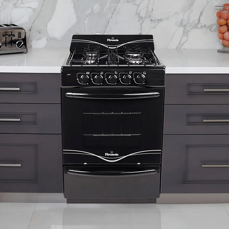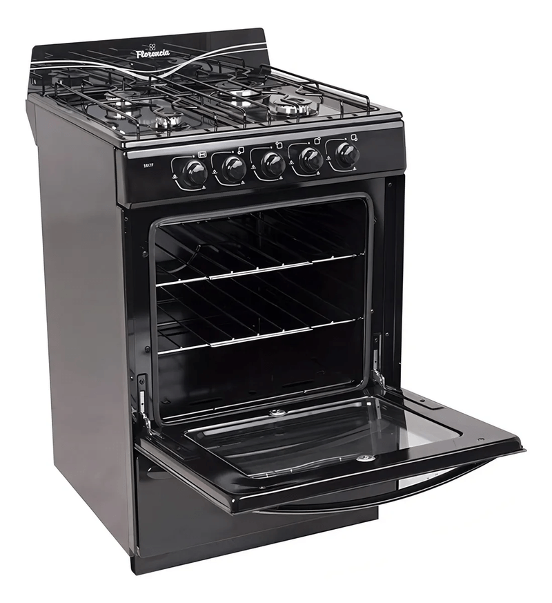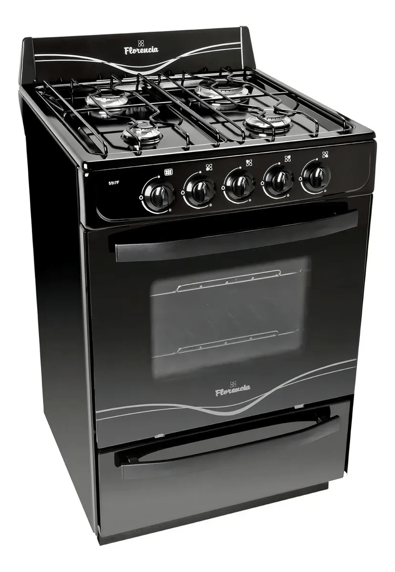 Florencia 5517F cocina a gas combina funcionalidad y estilo en un formato compacto de 56 cm de ancho, ideal para cocinas con espacio limitado. Su terminación en color negro le da un toque moderno y sobrio, mientras que las rejillas de alambre enlozado aseguran resistencia y fácil mantenimiento. La puerta del horno con doble cristal mejora la aislación térmica y permite una mejor visibilidad durante la cocción.