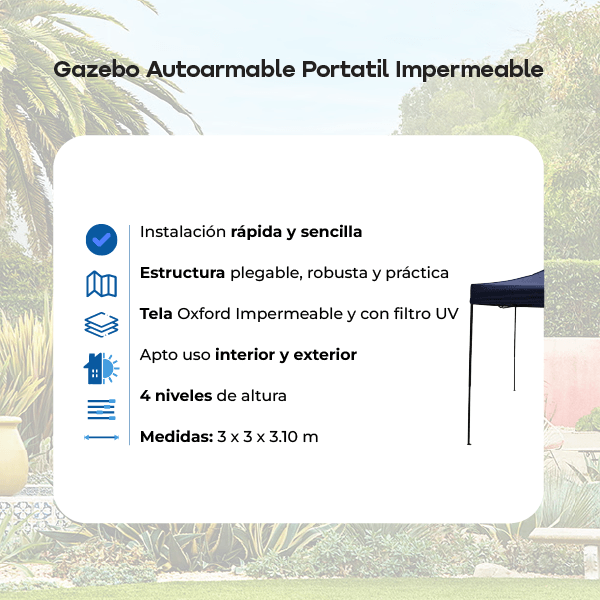 Este gazebo combina diseño innovador y facilidad de uso. Su estructura robusta y de fácil armado te permite disfrutar de tu espacio exterior en minutos, sin complicaciones. Con mayor resistencia y estabilidad, es ideal para cualquier ocasión. ¡Hazlo tuyo hoy y transforma tu jardín en el lugar perfecto para relajarte!