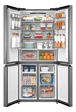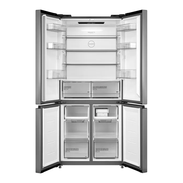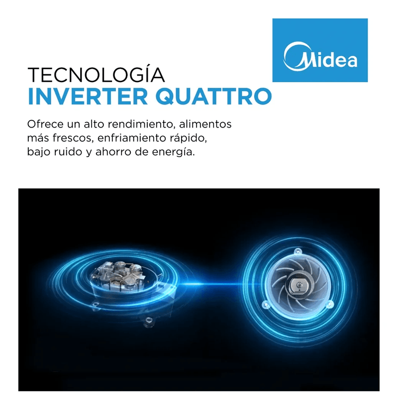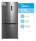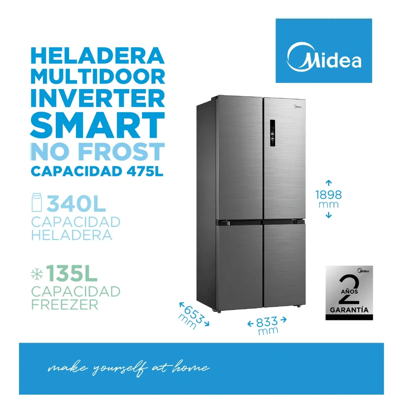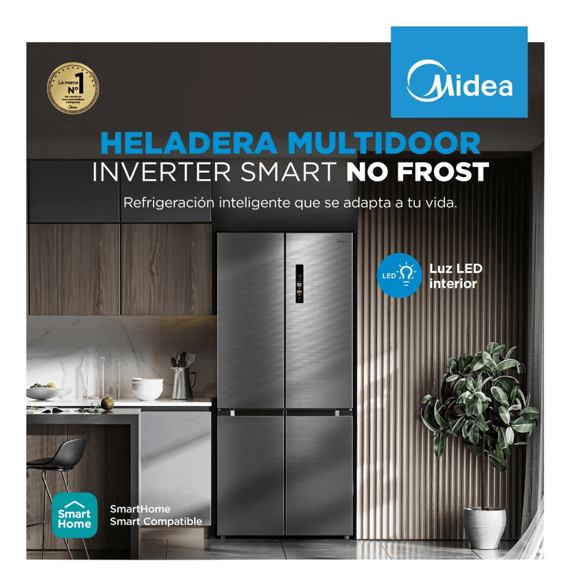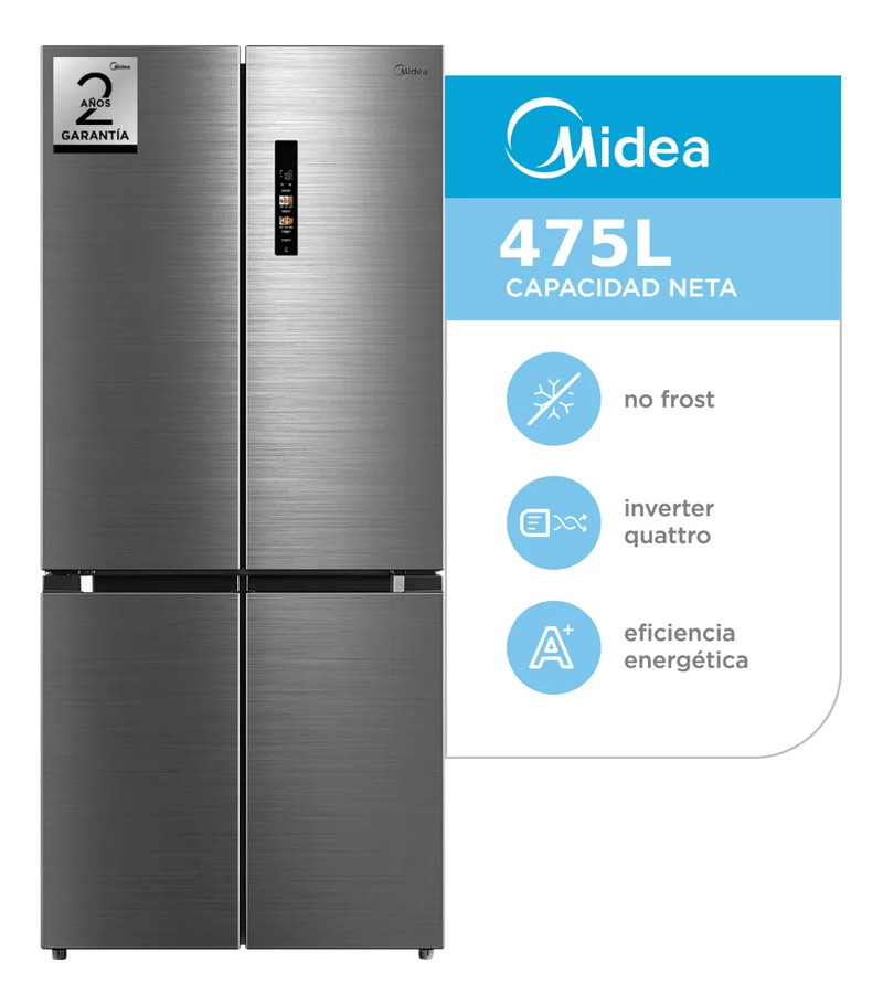 Esta heladera Midea de 475 litros (modelo MDRM691FGF46AD) es un equipo de gama alta que destaca por su diseño Multi Door (cuatro puertas) y su conectividad Smart. Es una excelente opción si buscás eficiencia energética y una organización superior.