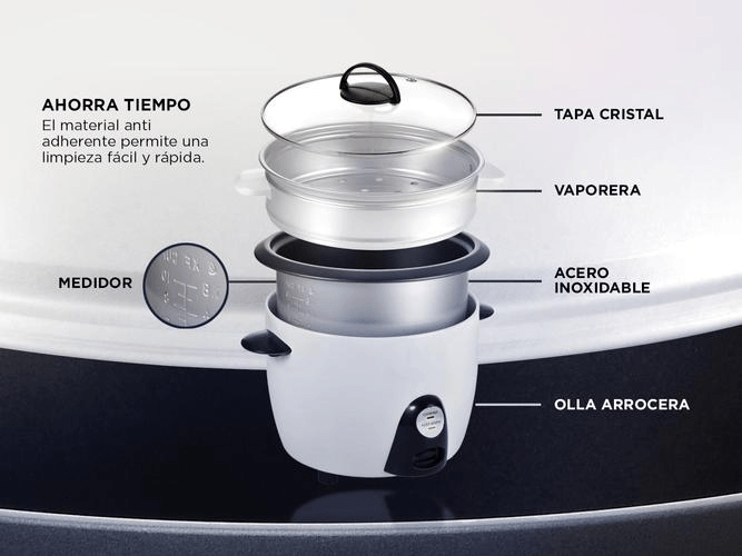 La arrocera cuenta con un sistema para mantener la temperatura de tus platos y calentarlos. El material anti adherente de la olla permite que la limpieza del artefacto sea fácil y rápida