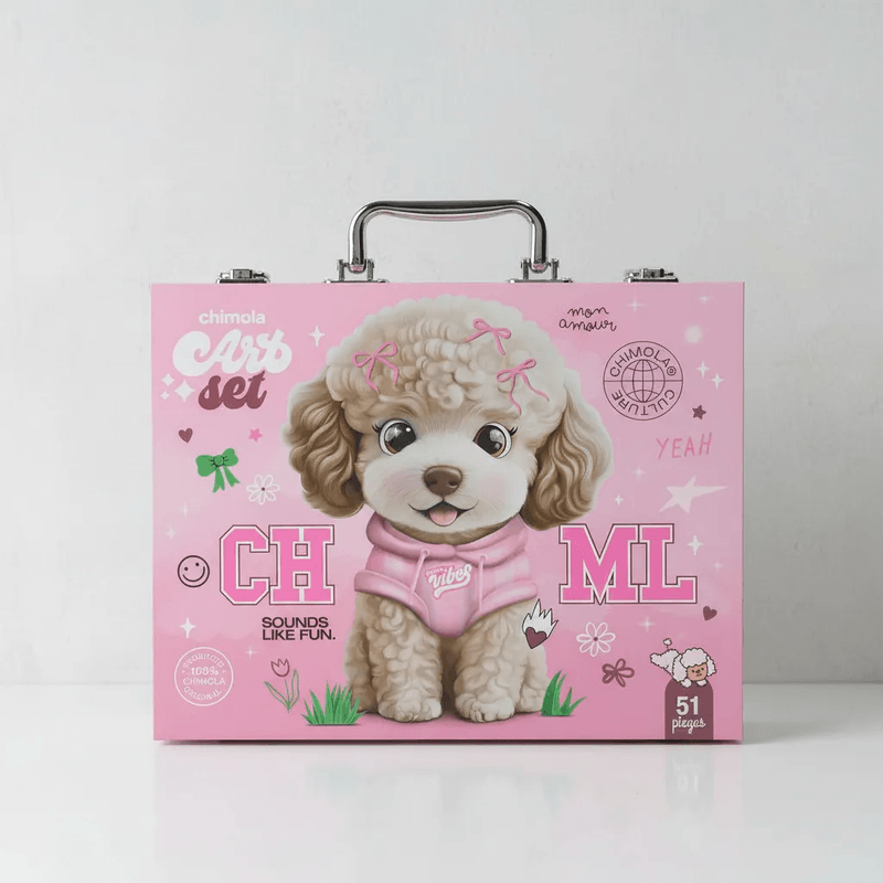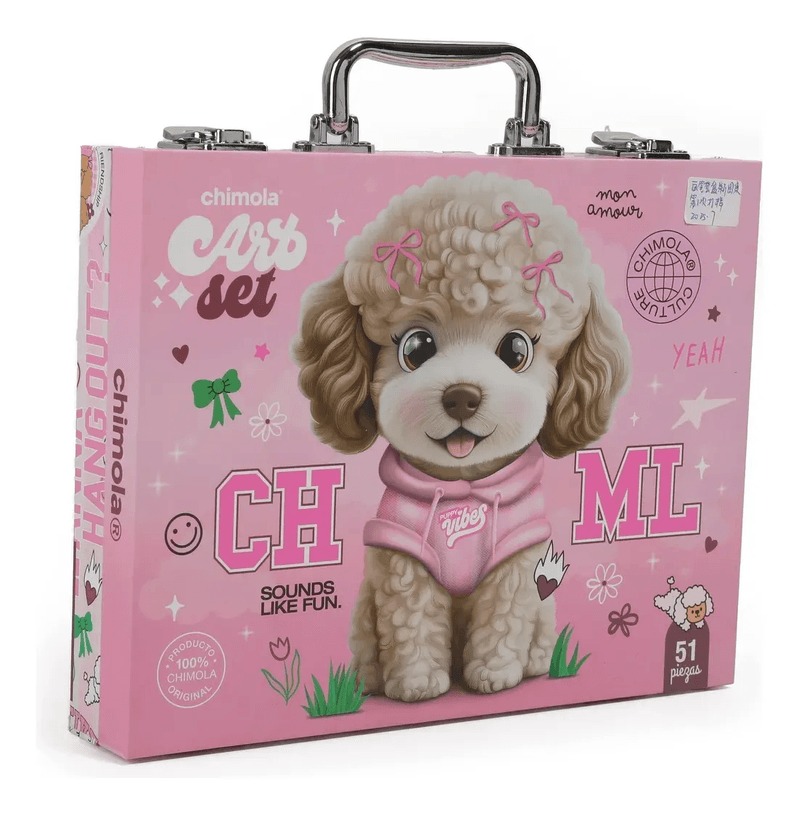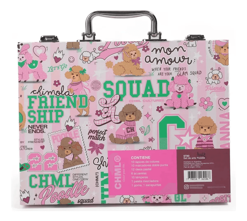 ¡Despertá el talento artístico con el estilo único de Chimola! Este set premium de la línea Poodle ofrece una variedad increíble de herramientas para dibujar, pintar y crear. Todo viene organizado en un maletín rígido decorado, perfecto para llevar la inspiración a todos lados: a casa de amigos, de vacaciones o al colegio.