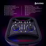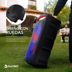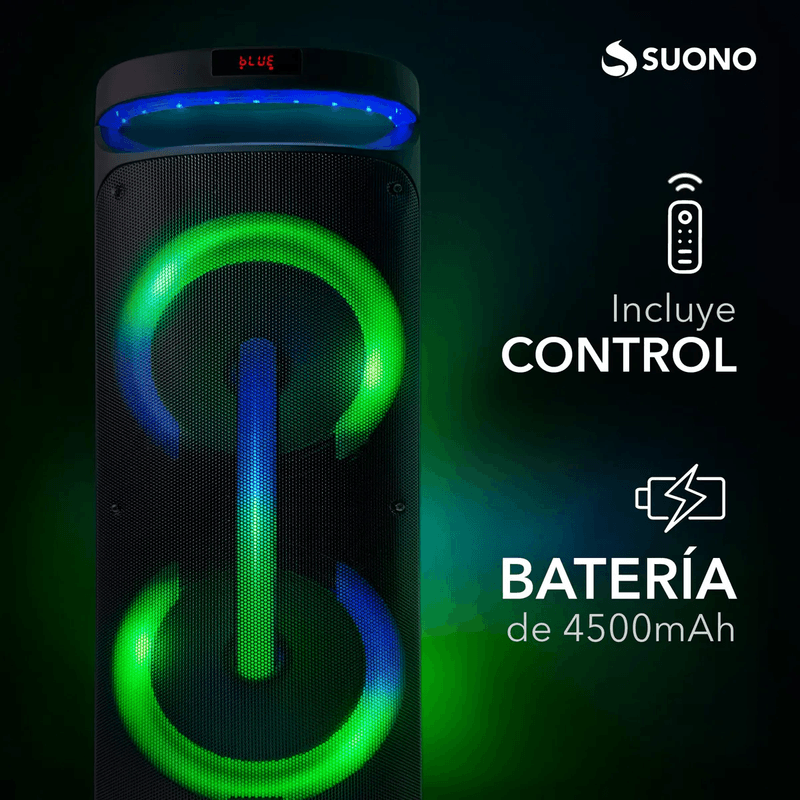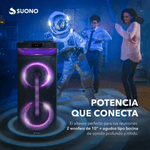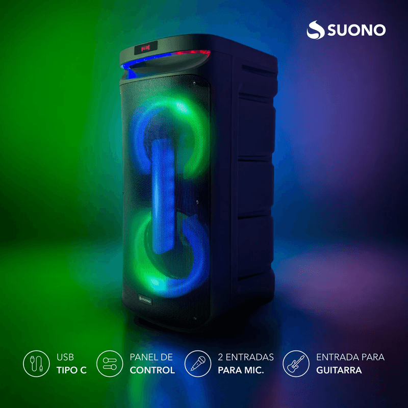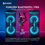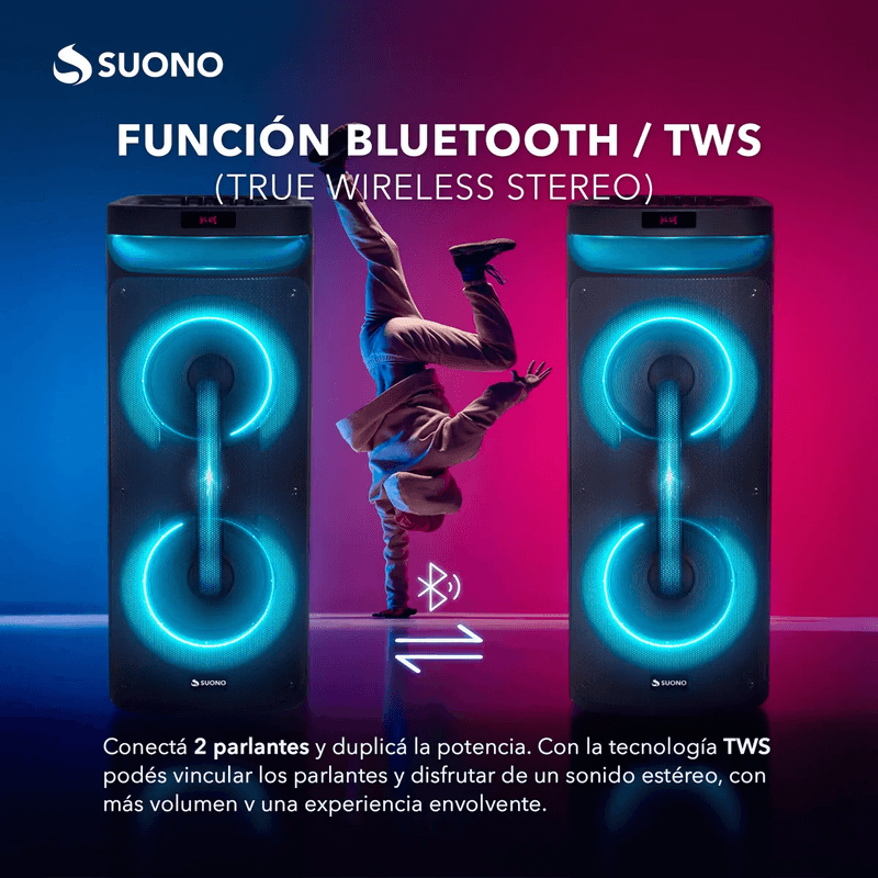 - Conexión Estéreo (TWS): Tecnología True Wireless Stereo que permite enlazar dos torres Suono de forma inalámbrica para duplicar el volumen y la cobertura.